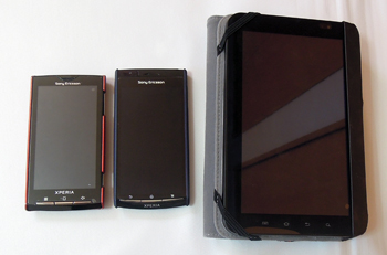 左から初代Xperia・Xperia arc・GalaxyTabのサイズ比較です。